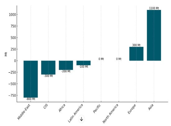 The 2021 oil trade balance broken down by region in millions of tons. Source: Enerdata World Energy & Climate Statistics—Yearbook 2022 [].