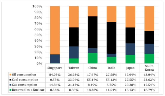 However, these countries are still facing several challenges that have been slowing their energy transition down towards green and sustainable energy due to their dependence on conventional sources of power generation. Coal and oil still account for most of the energy consumption in the case countries [], as can be seen in Figure 3 []. For the short to medium term, the priority for these nations has been the phasing down and ultimately the phasing out of coal primarily through coal-to-gas switching, especially as their economies are largely built on the hard-to-abate industrial sector [,], with the only exception being Singapore. This partly explains the recent increase in long-term agreements over deliveries of liquified natural gas (LNG).