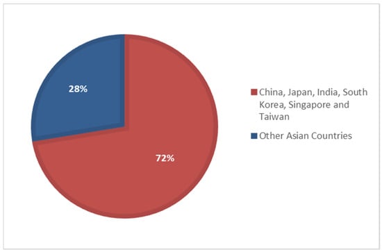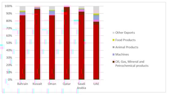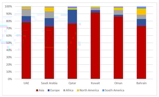 The Gulf Cooperation Council (GCC) countries have been economically relying on their oil and gas industry for decades as they hold some of the world’s largest reserves and as they have not managed to sufficiently diversify their economy, despite important programs, reforms, and investments to do so [,,]. The oil, gas, and petrochemical industries have generated significant economic output to their respective nations as well as important diplomatic leverage and soft power gains. Accordingly, during the last few decades, oil and gas exports have accounted for more than 75% of each country’s total exports, as represented in Figure 4 [,]. In recent years, East and South Asian countries represented 70% of these total exports, as displayed in Figure 5 [].