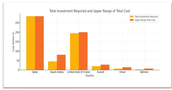 In this regard, in August 2022, QatarEnergy signed agreements with Industries Qatar and Qatar Chemical Fertilizer Company to construct a blue ammonia plant capable of producing up to 1.2 million tons of blue ammonia per year []. Ammonia currently stands as a more cost-effective means to transport hydrogen, as it demands less energy for cooling during transportation and storage compared to hydrogen. This makes ammonia a viable and sustainable interim solution especially for energy storage and chemical applications until the technological and economic viability of green hydrogen production advances further []. While not directly convertible to hydrogen, the magnitude of the investment in ammonia production is a strong indicator toward the future of large-scale hydrogen production.