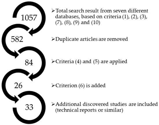 Based on these 1057 search results, another sorting was done to remove duplicate articles, whereafter criteria four (4) and five (5) were applied, leaving the intended analysis with 84 papers to be studied. As the literature review intends to find established connections between the VRE penetration rate and initial LDES technology usage, these 84 papers were further reduced by adding requirement six (6): inspection of the content to find indications or statements of such a connection. This inspection was conducted by carefully scrutinising the papers, reading through the text and examining figures, tables, and possible Supplementary Materials. Of these 84 articles, a link between the two factors can be found in 26. As this entailed a more detailed analysis, seven more technical studies were discovered containing applicable information to the review at hand. Altogether, these 33 papers (enumerated in Supplementary Materials—File S1) create the foundation of this literature review. Notably, the additional seven studies included do not follow all the original ten criteria since these studies were discovered through the process of snowballing, as visible below in Figure 1.
