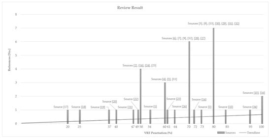 Figure 2 is a visualisation of the result from Table 3, showing that 80% VRE penetration is the most referenced value for the tipping point of LDES market creation. However, this review reveals a significant inconsistency in how the literature portrays LDES utilisation in relation to VRE penetration, with values for VRE penetration ranging from 20% to 100%. A linear trendline is included (y = 0.006x + 0.0079) to indicate that the reference amount grows with growing VRE penetration percentage values.