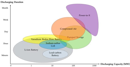 The literature has established that a combination of balancing technologies with varying durations and characteristics will create the most optimised system [,,]. Moreover, certain technologies, such as flow batteries, are seen as particularly promising for stationary energy storage []. Therefore, assumptions in the modelling stage on what LDES technologies are available will impact when the LDES segment becomes competitive when weighted against the VRE penetration rate, for example as in Belderbos et al. [], where only power to gas (P2G) is available as an LDES resource, compared to Schill and Zerrahn [], where also pumped hydro energy storage (PHES) is considered. PHES may be more competitive in shorter durations than P2G, possibly leading to LDES utilisation at lower rates of VRE penetration (depending on other available flexibility options and model assumptions). This is visualised in Du et al. [], where an overview was created of typical energy storage technologies and their suitable durations (Figure 3).