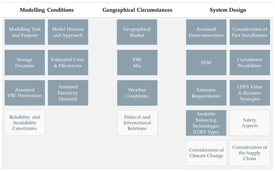 Although not considered in the reviewed papers, politics and world order heavily influence the power sector. This has been evident in the Russia and Ukraine conflict, where restrained natural gas supply created turmoil in European Union (EU) markets []. This, in turn, has accelerated interest in hydrogen and self-sufficiency [], directly linking LDES to the discussion, which could speed up the deployment of the technologies.