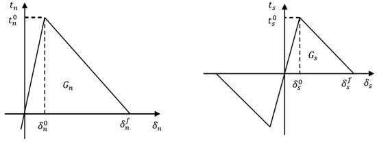 Damage modeling can be used to simulate the degradation and ultimate failure of the strengthening elements. The failure mechanism consists of two components: the damage initiation criterion and the damage evolution law. As shown in Figure 1, the bilinear traction–separation constitutive model of element stiffness degradation realizes the damage evolution of the cohesive element and then simulates the fracture initiation and propagation. Before the onset of damage, the element’s constitutive relationship is linear elastic. Once the damage criterion is met, the element’s stiffness gradually degrades until it loses its load-bearing capacity.