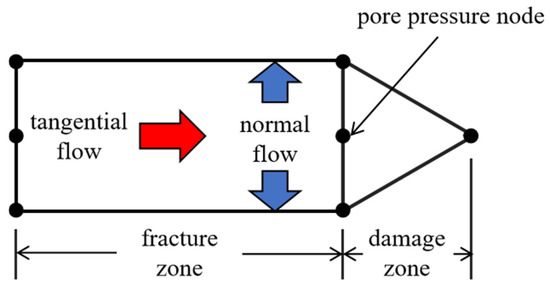 After the cohesive element is completely damaged, fluid enters the element, exerting pressure on the fracture walls. This process simulates the propagation behavior of hydraulic fractures. As shown in Figure 2, within the damaged cohesive element, the fluid is divided into tangential and normal flows. Tangential flow promotes fracture propagation, while normal flow shows how some of the fracturing fluid penetrates into the formation.