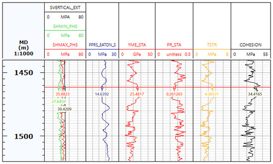 Based on the geophysical logging data and completion engineering practices of the infill wells in the Linxing–Shenfu block, the Shihezi formation in this block is selected as the target research formation. The formation is located at a depth of approximately 1350–1900 m, characterized by a low and gentle structural background and widespread interbedding of sandy mudstone in vertical distribution. The changes in thickness of interlayers and reservoirs within the formation vary between 3–20 m and 5–30 m, respectively. The reservoir is dominated by tight reservoirs with a porosity of 10% and permeability of 1 mD. Natural fractures are not well developed, and the hydraulic fracturing fractures are mainly in the form of single planar fractures. Figure 3 and Figure 4 are typical physical properties and rock mechanics parameters of Shihezi formation obtained from the interpretation and calculation of logging data of fractured wells in the target block. Table 1 and Table 2 show the specific parameter settings for this model, which mainly include formation parameters, pressure parameters, and operational parameters. For different research contents, corresponding parameters are changed to carry out numerical simulation and comparative study of the patterns.