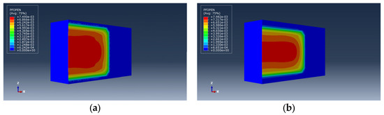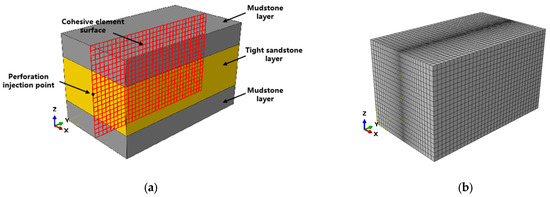 As shown in Figure 5a, the model adopts a fully three-dimensional stratified model, with overall dimensions of length 100 m × width 70 m × height 70 m. The middle layer consists of a tight sandstone reservoir with a thickness of 30 m, while the upper and lower layers are shale interlayers with thicknesses of 20 m each. The wellbore direction in the model is perpendicular to the interlayers, simulating the hydraulic fracturing scenario of a vertical well, and the initiation and propagation of hydraulic fractures in the formation are simulated by inserting cohesive element faces. During the simulation of the fracturing process, the fractures will propagate along the pre-set cohesive element faces. By analyzing the failure of cohesive elements, the geometric morphology of the fractures can be obtained. The model is subjected to minimum horizontal , maximum horizontal , and vertical in situ stresses in the x, y, and z directions, respectively. The outer boundary of the model is set as fixed displacement and with impermeable boundary conditions.