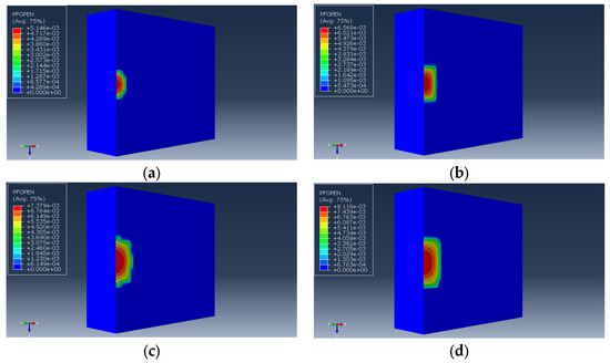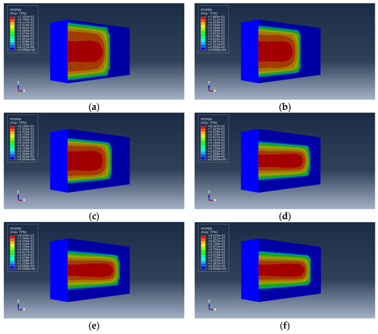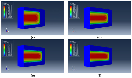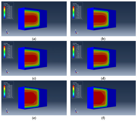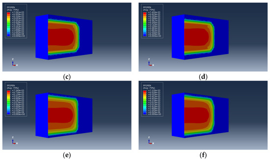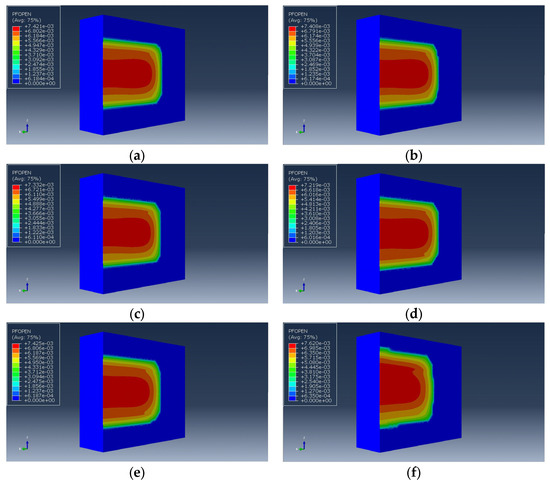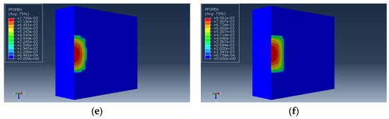 In Figure 13, it can be observed that, overall, the contrast in Poisson’s ratio has little influence on the vertical expansion of hydraulic fractures. The fractures propagate through the layers into the barrier layer, and the final morphology is almost identical. Only when the Poisson’s ratio of the barrier layer is significantly higher than that of the reservoir layer (exceeding 0.04) does the height of the fracture increase. Analysis suggests that Poisson’s ratio reflects the plastic behavior of the formation rock. The greater the Poisson’s ratio, the greater the impact on fracture height. However, for most mudstone or shale barrier layers, the Poisson’s ratio falls within a certain range. Therefore, the contrast in Poisson’s ratio between the barrier and reservoir layers does not strongly inhibit the vertical propagation of fractures.