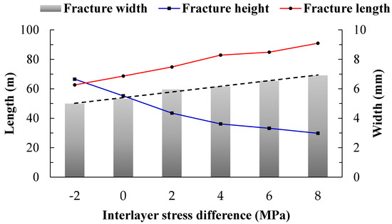 It can be observed from Figure 3 that as the interlayer stress difference between shale interlayers and reservoir layers increases, the height of the hydraulic fractures decreases, while the length and average width of the fractures increase. This indicates that the inhibitory effect on the vertical expansion of hydraulic fractures strengthens with the increase in interlayer stress difference. When the interlayer stress difference is less than 4 MPa, a large amount of fractures penetrate into the interlayer vertically, resulting in uncontrolled fracture height. However, when the interlayer stress difference exceeds 4 MPa, the entry of fractures into the interlayer is significantly inhibited, leading to a significant reduction in fracture height. When the interlayer stress difference increases to 8 MPa, the fractures are completely confined within the reservoir, resulting in relatively larger fracture length and width. It is also observed that under constant fracturing fluid volume and formation loss, there is a trade-off relationship between fracture height, length, and width. Smaller fracture height corresponds to larger fracture length and width within the reservoir, resulting in a larger effective fracture volume. Therefore, a higher interlayer stress difference is advantageous for controlling fracture height, reducing fracturing fluid wastage, increasing the effective fracture volume within the reservoir, and improving the efficiency of reservoir stimulation.