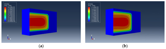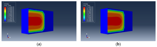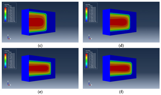 where , , are the actual stress acting on the cohesive element, , , are the stress acting on the cohesive element under undamaged stiffness conditions, and is a dimensionless damage factor with a value between 0 and 1. When , the material is not damaged, and when = 1, the material is completely damaged. It is defined as follows: