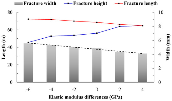 Hydraulic fracture calculation results under different barrier/storage layer elastic modulus differences.