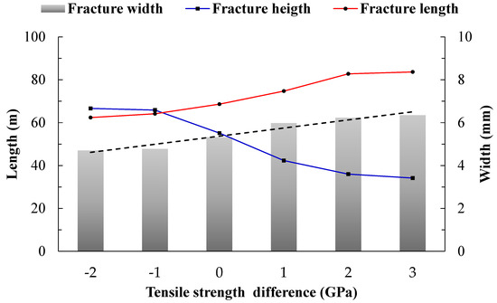 Figure 15 displays that as the difference in tensile strength between barrier and reservoir formations increases, the height of hydraulic fractures decreases while the length and average width of the fractures increase. This indicates that the inhibitory effect on vertical propagation of hydraulic fractures strengthens with the increasing difference in tensile strength between barrier and reservoir formations. When the difference in tensile strength is less than 1 MPa, the control of fracture height is greater than fracture length. However, as the difference in tensile strength changes from negative to positive, the fracture height decreases significantly, accompanied by a gradual increase in fracture length and width. When the tensile strength difference exceeds 2 MPa, the height of the fractures approaches the thickness of the reservoir, and vertical fracture propagation into the barrier formation is noticeably inhibited. Analysis suggests that the essence of fracture extension is the continuous hydraulic fracturing of rock. The net fluid pressure inside the fracture must overcome the intrinsic strength of the rock to cause damage and continue forward propagation. Therefore, when the tensile strength of the barrier formation is higher, vertical propagation of hydraulic fractures is inhibited.