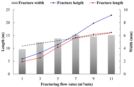 Due to the competition between fracture height and length during the initial stage of fracture propagation, further simulations were conducted to investigate the initial expansion of hydraulic fractures under different fracturing flow rates. The fracturing flow rates were varied to 1, 3, 5, 7, 9, and 11 m3/min, studying their influence on the vertical expansion of hydraulic fractures during the initial stage. The morphology of fracture initial expansion and the corresponding results are illustrated in Figure 16 and Figure 17, respectively.