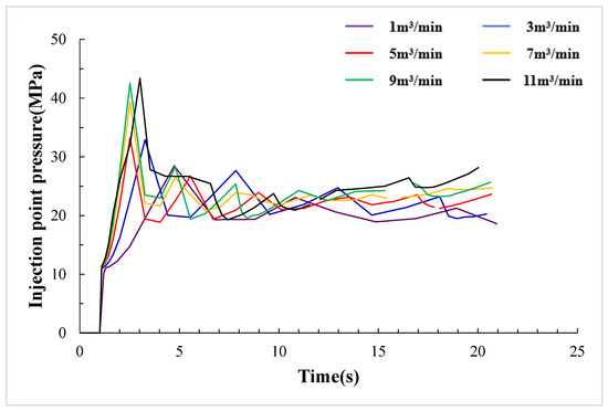 In Figure 17, it can be seen that with the increasing flow rate, the initial height, length, and average width of hydraulic fractures also increase continuously. When the flow rate is relatively low (between 1 and 7 m3/min), the growth rate of fracture height is slow while fracture length increases rapidly. However, when the flow rate is high (between 7 and 11 m3/min), the fracture height increases sharply with the flow rate, while the growth rate of fracture length significantly slows down. When the flow rate reaches 11 m3/min, the fracture height is approximately 2–4 times that of the low flow rate, indicating a significant impact of flow rate on the vertical expansion of hydraulic fractures. As shown in Figure 18, the fluid pressure within the fracture will increase significantly with the increase in displacement. Although the higher net pressure in the fracture promotes the fracture extension, it will also cause the fracture height to increase significantly.