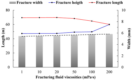 Calculation results of hydraulic fractures under different fracturing fluid viscosities.