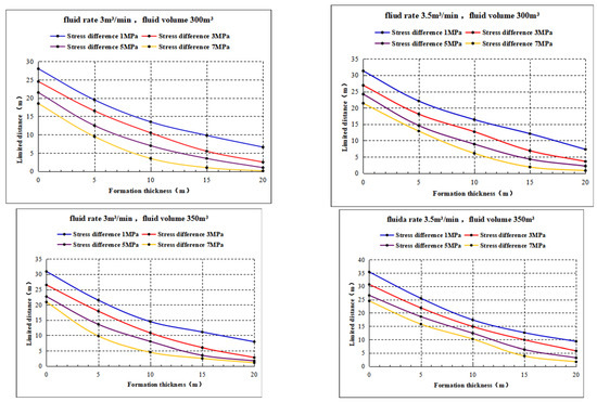 The equation also includes H as the height of the supporting fracture, in meters, and h as the thickness of the reservoir, also in meters. For the typical geological mechanics and commonly used construction parameters in the real-field formation, a numerical model for predicting fracture height is established. It simulates the limit distance of fractures penetrating layers under different reservoir thicknesses (2 to 20 m), pumping rates (3 to 3.5 m3/min), and net fluid volumes (300 to 350 m3). The key parameters of the model are shown in Table 4, and the fracture height prediction chart is illustrated in Figure 22.