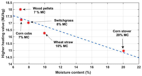 The effect of wet basis moisture content (%) on the higher heating value (MJ/kg) of biomass types (adapted from [31]).