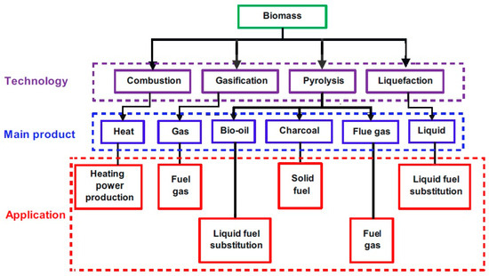 Biomass turns into bioenergy thermochemically through combustion, gasification, pyrolysis, and liquefaction technologies. Combustion of biomass occurs in the first three subdivisions, with differences in combustion conditions and the form of energy product. Each pathway yields different types of products and is applied for a specific range of applications. These are expressed in Figure 3. Each technology will be discussed in detail in the following subsections:
