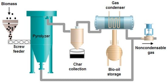 Pyrolysis is a fundamental process of all thermochemical conversions since it occurs during these processes to compose gaseous, liquid, and solid products [55]. Pyrolysis is a kind of processing wherein the organic materials are disintegrated in an oxygen-free environment, under pressure and at around 500 °C. The pyrolyzing process is identical to gasification, and the main outputs are bio-oil, charcoal, and flue gas. The schematic of a typical pyrolysis process is depicted in Figure 4.