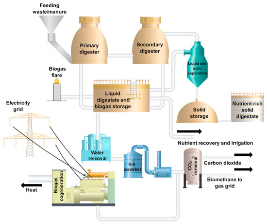 Anaerobic digestion is a process with biogas as an output that comprises 50–60% methane, ~40–50% carbon dioxide, and others (e.g., H2S). Moreover, bio-fertilizer is a by-product of the conversion that is rich in nutrients and can be processed further for other applications. Non-woody biomass is converted to valuable gas via micro-organisms in an oxygen-free environment. High-moisture feedstocks are suitable for anaerobic digesting, a technically feasible technology [68,69]. Figure 5 depicts the typical layout of an anaerobic digestion plant integrated into a cogeneration unit.