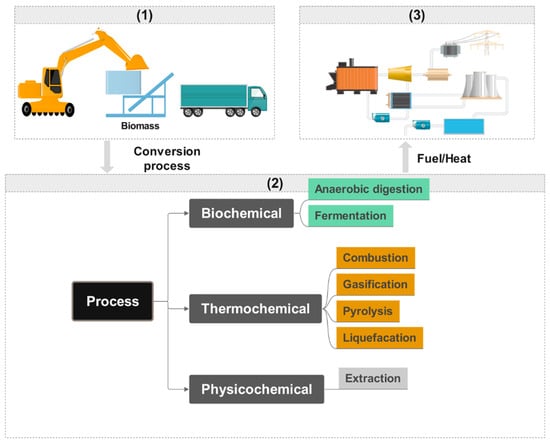 Obtaining bioenergy from biomass is undertaken using three primary processes: thermochemical, biochemical, and physicochemical. Combustion, pyrolysis, gasification, and liquefaction are the four main process options for thermochemical conversion, while biochemical conversion comprises anaerobic digestion (AD) and fermentation as the two primary options. Meanwhile, mechanical extraction is specified as a physicochemical conversion technology. These technologies are briefly described below.