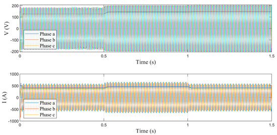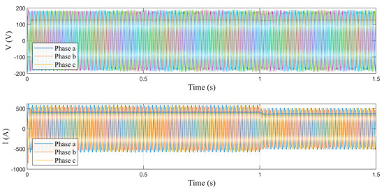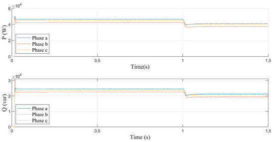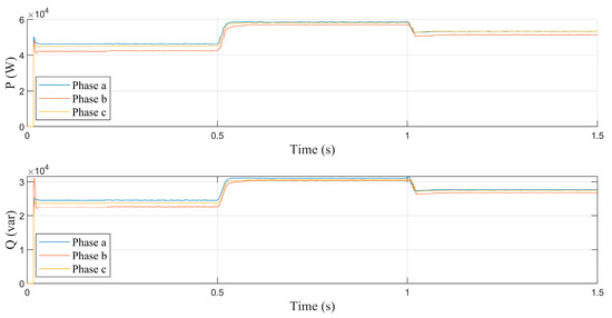Figure 3 shows the dynamic behavior of variables such as current and AC bus voltage under normal operating conditions (without fault conditions). As can be seen, the value for both voltage and current demonstrates proper system operation, even in the presence of an unbalanced system. One second into operation, an abrupt load disturbance occurs, causing a typical minor variation in voltage that is immediately compensated for by the MG’s hierarchical control and the BESS. The load disturbance results in a reduction in the active and reactive power of the MG’s electrical system (Figure 4).
