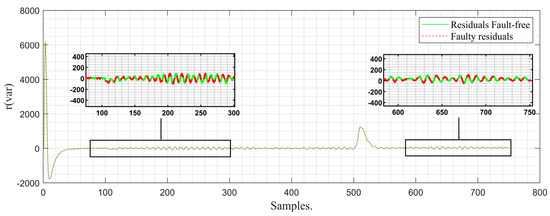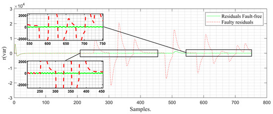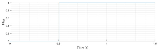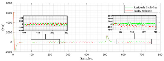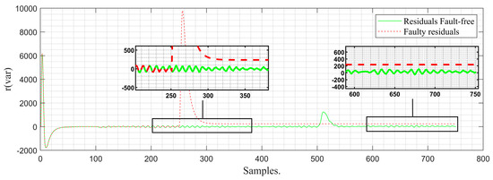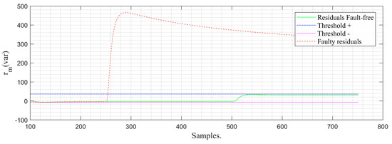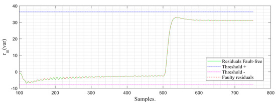 In Figure 12, the behavior of the incipient (progressive) failure can be seen. As time goes by, it can be observed that the observer’s signal and that of the fault-free residues do not present a visible difference, which is why, in this instance, it is not possible to determine the existence of a fault by delineating a tolerance band. For this reason, it is necessary to apply the residue management algorithm, thereby achieving greater separability between faulty residues and fault-free residues, as shown in Figure 13. As a result, the occurrence of the sensing fault based on the faulty residue can be determined due to the existing difference between the faulty residue and the fault-free or normal operation residue. With the +/− thresholds defined based on the normal operation class, the value of exceeds the negative threshold, triggering the fault flag (Figure 14). It is worth noting that the detection time of the strategy from the moment of fault occurrence to its detection is 0.06 s. This time is given by the difference between the moment the fault flag is activated and the moment the fault occurs. In other words, it is the delay of the system in recognizing a specific fault.