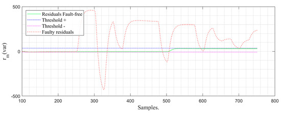 In Figure 10 and Figure 11, the response of the proposed system for residue evaluation is observed. By generating greater separability of the faulty residue, the mean residue rm(t) allows for the establishment of appropriate thresholds to ensure detection. Detection relies on the constant monitoring of rm(t) to determine whether rm(t) remains within the +/− threshold limits. The moment rm(t) falls outside the tolerance band defined by the thresholds, a fault flag is raised (from 0 to 1), indicating the occurrence of a sensor fault. In a real (physical) system, it would be recommended to replace the sensor to allow the system to return to normal operation.