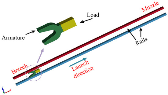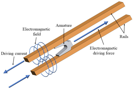 According to the different structures and operating principles, the electromagnetic launcher can be divided into rail launcher, induction coil launcher and reconnection launcher [4,5,6]. The schematic diagram of the electromagnetic rail launcher is shown in Figure 1. It mainly consists of two parallel rails and an armature, which maintains good contact with the rails and can slide in a straight line along the rails [7,8,9]. The driving current flows through the circuit formed by the rails and the armature [10,11]. After the current passes, a strong magnetic field is generated between the two rails, which interacts with the current on the armature to generate an electromagnetic force [12]. The armature is driven when the electromagnetic force is greater than the frictional force. And it is accelerated to hypervelocity [13].