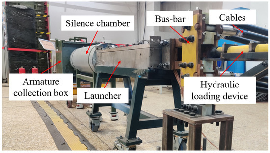 Nine sets of experiments were carried out. Each set included three shots, and the aluminum deposited on the rail was cleaned after each experiment to ensure that the initial experimental conditions were the same. The experimental equipment mainly consists of a 270 kJ pulsed power supply, a 12 mm small diameter launcher and a pulsed power control system. The driving current, the voltage of muzzle and breech and the velocity of the ILP were measured by the Rogowski Coil with an accuracy of 0.02 mV/A, the high-voltage differential probe with an accuracy of 0.01 V and the B-dot with an accuracy of 0.02 μs. The experimental platform includes a hydraulic loading device, a bus-bar, cables, a small-caliber launcher, a silence chamber and an armature collection box, as shown in Figure 2. The armature is pushed to a specified position in the bore by the hydraulic loading device, and the electrical energy is gathered by the bus bar and fed into the rail, and the armature is collected by the armature collection box.