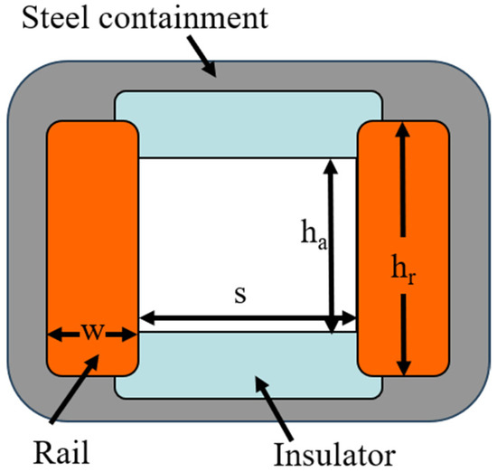 Figure 3 depicts the shape and specific parameters of the launcher’s bore cross-section. The launcher has two rails on the left and right sides, as well as two insulators at the top and bottom. The rails and insulators are encased in additional insulating materials and stainless steel shells on the exterior, ensuring the overall safety of the equipment. The main parameters of the bore are the rail height (hr), rail and armature contact height (ha), rail thickness (w) and rail separation (s).