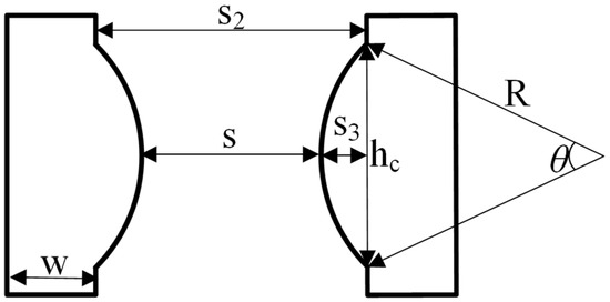 The analyzed rail shapes comprise a plane rail (with a convex arc height of 0 mm) and a convex arc rail (with a convex arc height of 0.5 mm and 1 mm, respectively), as shown in Figure 4. When the rail is plane, the rail separation (s) refers to the distance between the two rails; when the rail is convex, the rail separation (s) is generally defined as the distance between the peaks of the convex arcs. The convex rail parameters include the convex arc height (s3), chord length (hc), arc radius (R) and central angle (θ). The chord length (hc) and the rail armature contact height (ha) in the plane rail are equivalent and do not vary. The armature chord length (hc) is consistently 12 mm. The convex arc on the rail with a height of 0.5 mm has an arc radius of 36.25 mm and a central angle of 19.05 degrees. Similarly, the convex arc on the rail with a height of 1 mm has an arc radius of 18 mm and a central angle of 37.85 degrees.