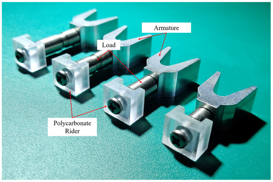 The ILP mainly consists of an aluminum alloy armature, stainless steel mass and polycarbonate rider. The physical diagram of the armature carrying different loads is given in Figure 5. The experimental parameters include the convex arc height (s3), rail separation (s) and load mass. Variations in rail separation and convex arc height have a minor influence on the armature’s mass and may be disregarded; the armature’s mass was determined to be 8.41 g by measurements. There were two different specifications for the loads, which were 3.15 g and 6.61 g. The change in the effective mass ratio (0, 0.28, 0.43, 0.49, 0.56) and the change in the overall mass of the ILP (8.41 g~18.71 g) are achieved by different combinations of loads.