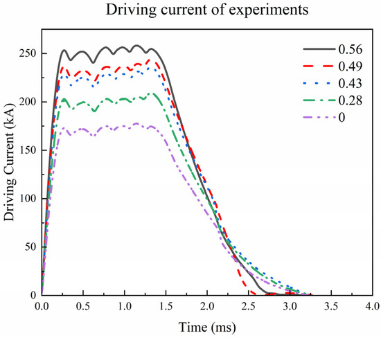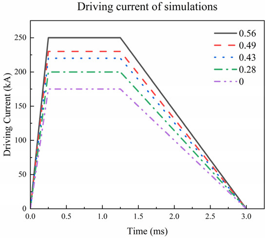 Figure 6 demonstrates the typical driving current waveforms at different effective mass ratios. The change in the effective mass ratio is accomplished by varying the mass of the load on the armature, and under the same bore parameters conditions, the armature mass remains constant. The change in the load mass will not only change the effective mass ratio of the ILP but also lead to a change in the total mass of the ILP. Due to the different total masses of the ILP (8.4 g~18.7 g), the amplitudes of driving current waveforms are calculated to be 175 to 250 kA in order to ensure that the ILPs have the same acceleration process in the bore and the same muzzle velocity, on the consideration of electromagnetic force, contact pressure and friction.