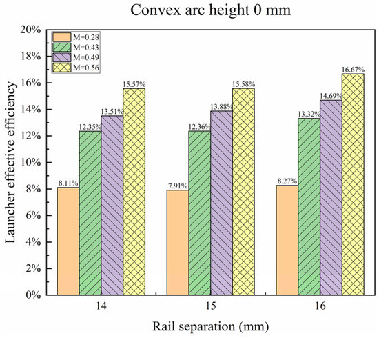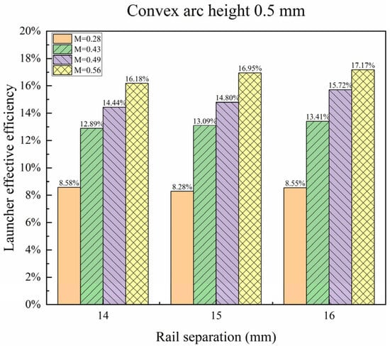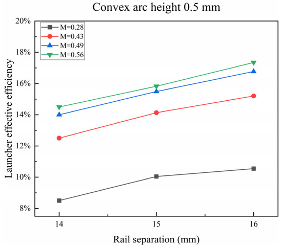 Figure 9 displays the change in launcher effective efficiency at a convex arc height of 0.5 mm, following the same trend observed in Figure 8. In the process of increasing the rail separation from 14 mm to 16 mm, the launcher effective efficiency increased by an average of 0.69%. When the rail separation was constant, the launcher effective efficiency rose by an average of 8.30% while the effective mass ratio increased from 0.28 to 0.56.