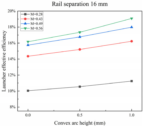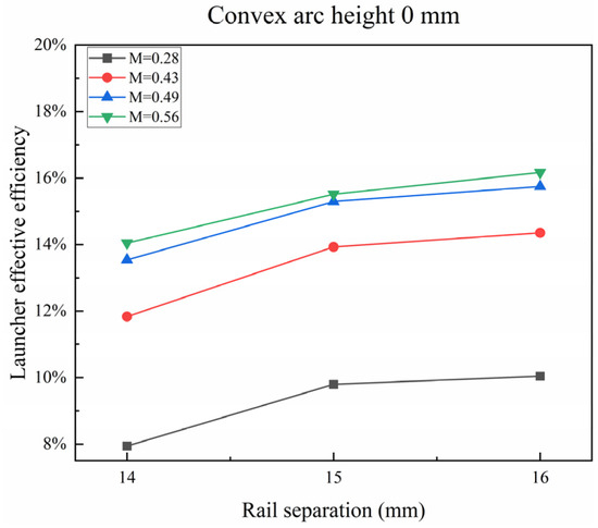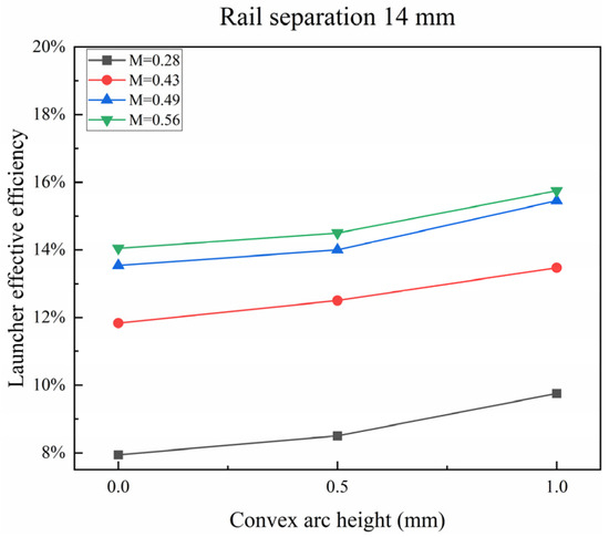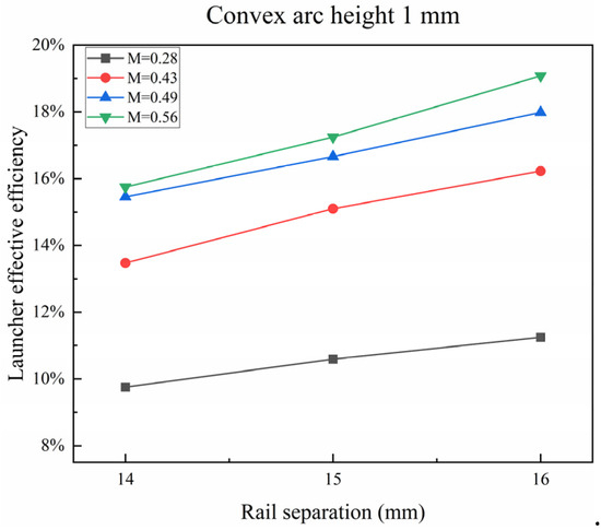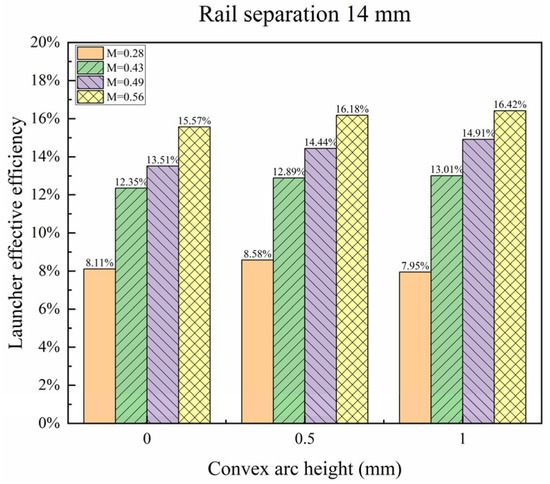 Figure 10 demonstrates the change in launcher effective efficiency at a convex arc height of 1 mm, similar to Figure 8. In the process of raising the rail separation from 14 mm to 16 mm, the launcher effective efficiency increased by an average of 0.74%. When the rail separation was constant, the launcher effective efficiency rose by an average of 8.67% while the effective mass ratio rose from 0.28 to 0.56.