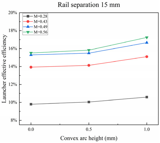 Figure 8, Figure 9 and Figure 10 indicate that when the convex arc height and the effective mass ratio remained constant, the launcher effective efficiency increased with increasing rail separation. Under different effective mass ratios, the launcher effective efficiency increased by an average of 0.70% with the raising of rail separation from 14 mm to 16 mm. This observation was related to the fact that increasing the rail separation improved the inductance gradient L′ of the launcher, and the growth in armature mass was relatively small. It was important to notice that the overall mass and effective mass ratio of the ILP remained substantially unaltered. Consequently, the rise in the inductance gradient L′ had a larger impact on the launcher effective efficiency than the increment in armature mass. Therefore, increasing the rail separation was identified as a component that positively affected the launcher effective efficiency.