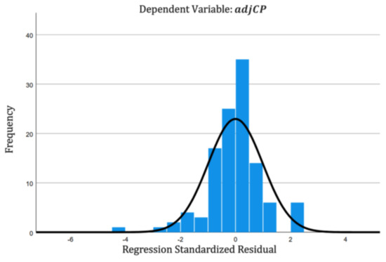 Normal distribution histogram of a multiple regression model for adjusting the GDP using carbon productivity by service and non-service sectors. (Note. adjCP: adjusted carbon productivity).