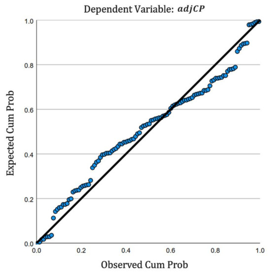 Normal P–P plots of the regression standardized residual of a multiple regression model for adjusting the GDP using carbon productivity by the service and non-service sectors. (Note. adjCP: adjusted carbon productivity).