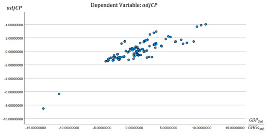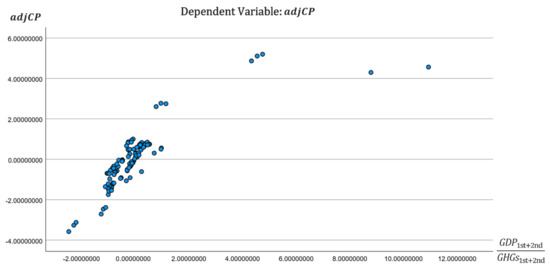 Therefore, this study used the OECD real GDP (base year 2015) and TGEs statistics (excluding LULUCF) by country and industry to design a regression model. This model derives the adjusted carbon productivity (adjCP) as a dependent variable and uses the value-added created by industry—where GDP1st+2nd represents the non-service industry GDP and GDP3rd represents the service industry GDP—versus greenhouse gas emissions by industry—where GHGs1st+2nd represents the non-service industry greenhouse gas emissions and GHGs3rd represents the service industry greenhouse gas emissions—as independent variables ( and , respectively). Multiple regression analysis was then performed based on this model.