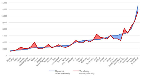 Regarding a carbon productivity correction, an improvement or decline in carbon productivity reflects the adjustments in the current estimation method. The adjusted carbon productivity in this study does not mean the actual carbon productivity but rather the current carbon productivity indicator. The adjusted carbon productivity indicator designed in this study highlights the discrepancies and adjusts for factors that might underestimate the carbon productivity of a country.