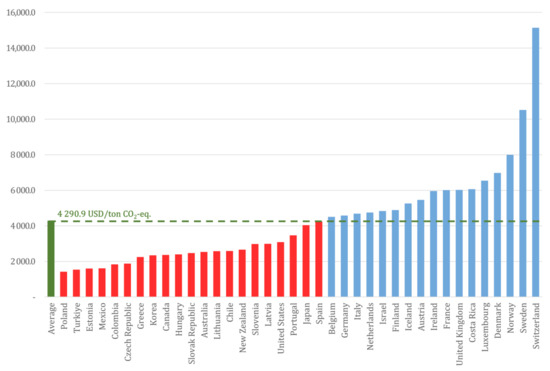 According to OECD Data Explorer (https://data-explorer.oecd.org/, accessed on 31 July 2024) on GDP and TGEs [23], Korea’s average per capita greenhouse gas emissions in 2019 was 13.5 tons CO2-eq., the sixth highest among 38 OECD countries and over 40% higher than the OECD average of 9.5 tons CO2-eq. Australia had the highest per capita emissions at 21.9 tons CO2-eq., approximately 1.6 times more than Korea. The United States and Canada followed, with 20.0 and 19.2 tons CO2-eq. per capita emissions, respectively. In contrast, Japan, with a high manufacturing sector similar to Korea, had per capita emissions of 9.6 tons, ranking 14th among OECD countries and approximately 70% of Korea’s emissions. Costa Rica had the lowest per capita emissions at 1.6 tons CO2-eq., followed by Colombia with 3.6 tons CO2-eq. and Sweden with 4.9 tons CO2-eq.