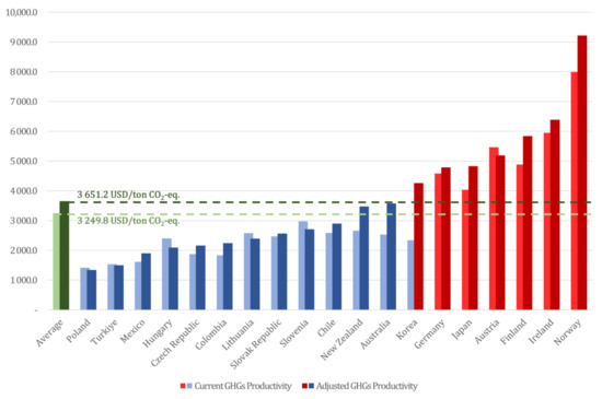 Current and adjusted carbon productivity rankings of non-service-sector-based countries in the OECD list (average of 2017 to 2019). (Note. The red color is below the average and the blue color is above the average).