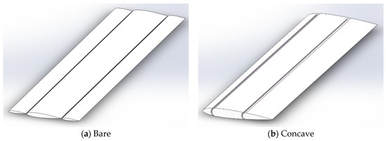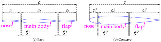 Referring to the cross-section of the “WindWings” described in the Introduction, the bare three-element wingsail is first modeled, and the geometry is obtained by stretching three NACA0012 airfoil profiles, as shown in Figure 3a. In addition, with reference to the “slotted flap” design of a two-element sail introduced by Blakeley [11], the airfoil profile of the bare three-element wingsail is optimized, resulting in a concave three-element wingsail, as shown in Figure 3b. Although this wingsail also consists of three parts, as a whole, it has the same shape as the single airfoil pattern. It should be noted that the cross-section type of both the bare and concave three-element wingsail is further designed based on the NACA0012 airfoil profile, and a detailed description of the configuration and parameters will be carried out in the following content.
