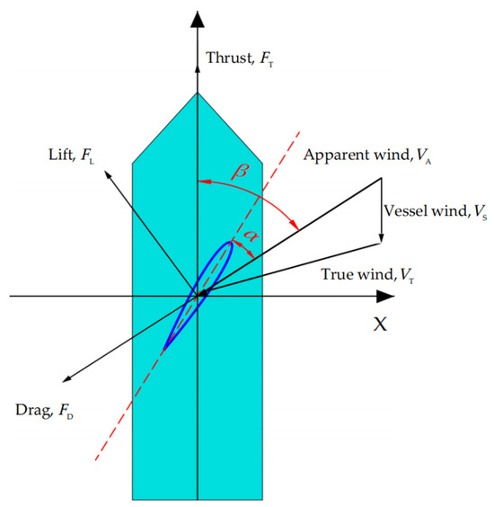 A wingsail is a rigid sail, similar to a wing, that utilizes the Bernoulli effect to generate aerodynamic forces. The airfoil profile allows airflow to pass through, creating a velocity difference, which in turn generates a pressure difference, i.e., lift. This lift, along with the friction component in the direction of sailing, constitutes the propulsive force (as shown in Figure 5). When a vessel is sailing, the wind acting on the surface of the wingsails consists of three components: apparent wind, true wind, and vessel wind. The direction of vessel wind is opposite to the vessel’s sailing direction, and the apparent wind is obtained by synthesizing the true wind and vessel wind vectors. The thrust can be determined by synthesizing the lift and drag components in the heading direction, where is the angle of attack (AOA), is the apparent wind angle (AWA), is the true wind speed (TWS), is the apparent wind speed (AWS), and is the wind speed caused by vessel sailing.