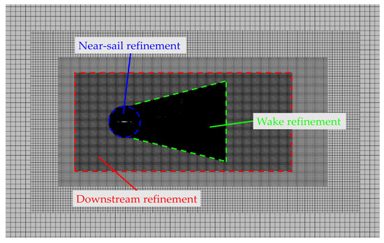 In STAR-CCM+, three meshers (Surface Remesher, Trimmed Cell Mesher, and Prism Mesher) are used to generate meshes, and the meshes for the near-sail, wake, and downstream regions are refined separately. The circular and trapezoidal zones near the wingsail allow flow detail features to be effectively captured. In addition, by adjusting various mesh parameters (including the base size, the relative target size, the minimum surface size, the number, and the thickness of prism layers), the final mesh structure is obtained, as shown in Figure 7.