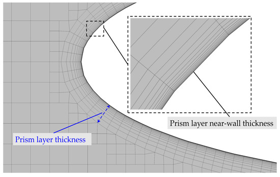 In the aerodynamic simulation of a wingsail, the meshes of the boundary layer have a significant influence on the results. This layer helps the solver to accurately resolve the flow near the wall, which is vital for determining forces or other flow features, such as separation [16]. Therefore, the prism layer mesher is used to generate the boundary layer. The number of layers is set to 20, the prism layer thickness is set to 0.01 m, and the thickness of the first layer is set to 1.0 × 10−5 m (as shown in Figure 8). As shown in Figure 9, the mean value of Y+ values for both bare and concave three-element wingsail surfaces is less than 1, proving that the boundary layer meshes meet the requirement of simulation accuracy.