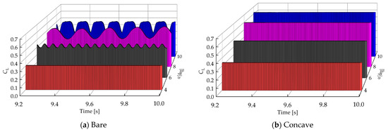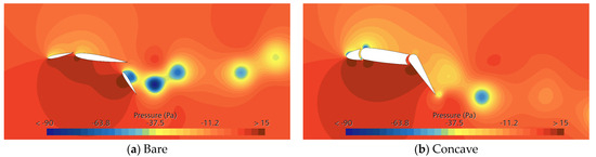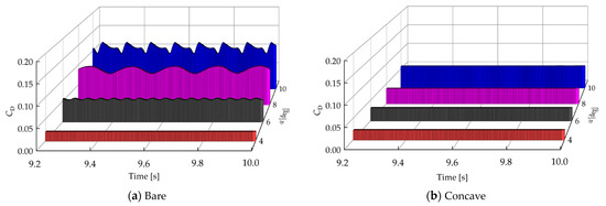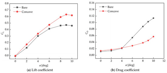 Since the aerodynamic performance of the wingsails is sensitive to AOA, the performance of an unfolded bare and concave wingsail at different AOAs is evaluated first. The lift and drag coefficients of the bare and concave wingsails are investigated in the AOA range of 0 to 10 degrees (as shown in Figure 11). The results show that the lift coefficients of both bare and concave wingsails increase in the range of AOA from 0 to 9 degrees, but a decreasing trend occurs at 10 degrees, with maximum lift coefficient values of 0.47 and 0.63 for bare and concave wingsails, respectively. In addition, the drag coefficients all increase with an increasing AOA. However, the analysis reveals that the difference in lift coefficients between the bare and concave wingsail increases significantly at an AOA greater than 4 degrees, and the drag coefficients similarly differ significantly at an AOA greater than 4 degrees, which may be related to the large change in the flow field, as will be further elaborated on later.