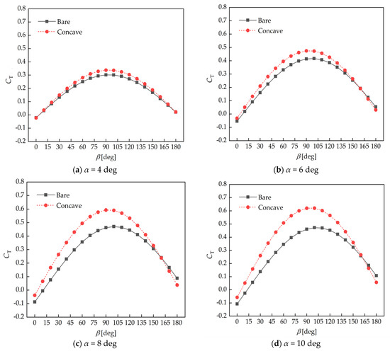 Focusing on thrust coefficients provides a more directly applicable perspective compared with individual lift and drag values when evaluating wingsail performance for maritime propulsion. As shown in Figure 14, a consistent increasing and then decreasing trend of the thrust coefficients for both bare and concave wingsails occurs at AOAs of 4, 6, 8, and 10 degrees, with peak values occurring around an AWA of 90 degrees. This indicates that wingsails are the most effective in practice when the apparent wind is a crosswind, and the crosswind direction is perpendicular to the vessel heading. In addition, the analysis reveals that the thrust coefficients of the concave wingsail are greater than those of the bare wingsail over most of the AWA range, and this difference increases with an increasing AOA. At an AOA of 10 degrees, the maximum thrust coefficients of the bare and concave wingsails are 0.47 and 0.62, respectively, with a difference of 32%.